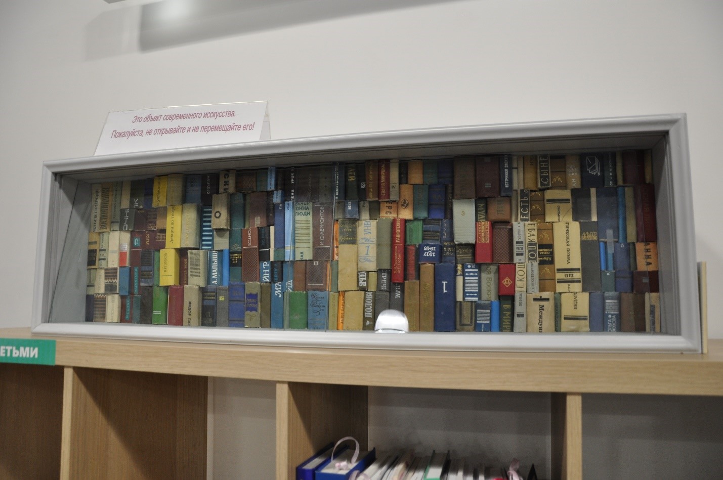 А в пункте буккроссинга находится работа Андрея Сяйлева «Штрихи». В этом произведении все книги разрезаны на две-три части. Перемешанные части не просятся собраться как паззл, но представляют вместе цельную картину, предлагая новый взгляд на привычное, уже ставшее классикой.