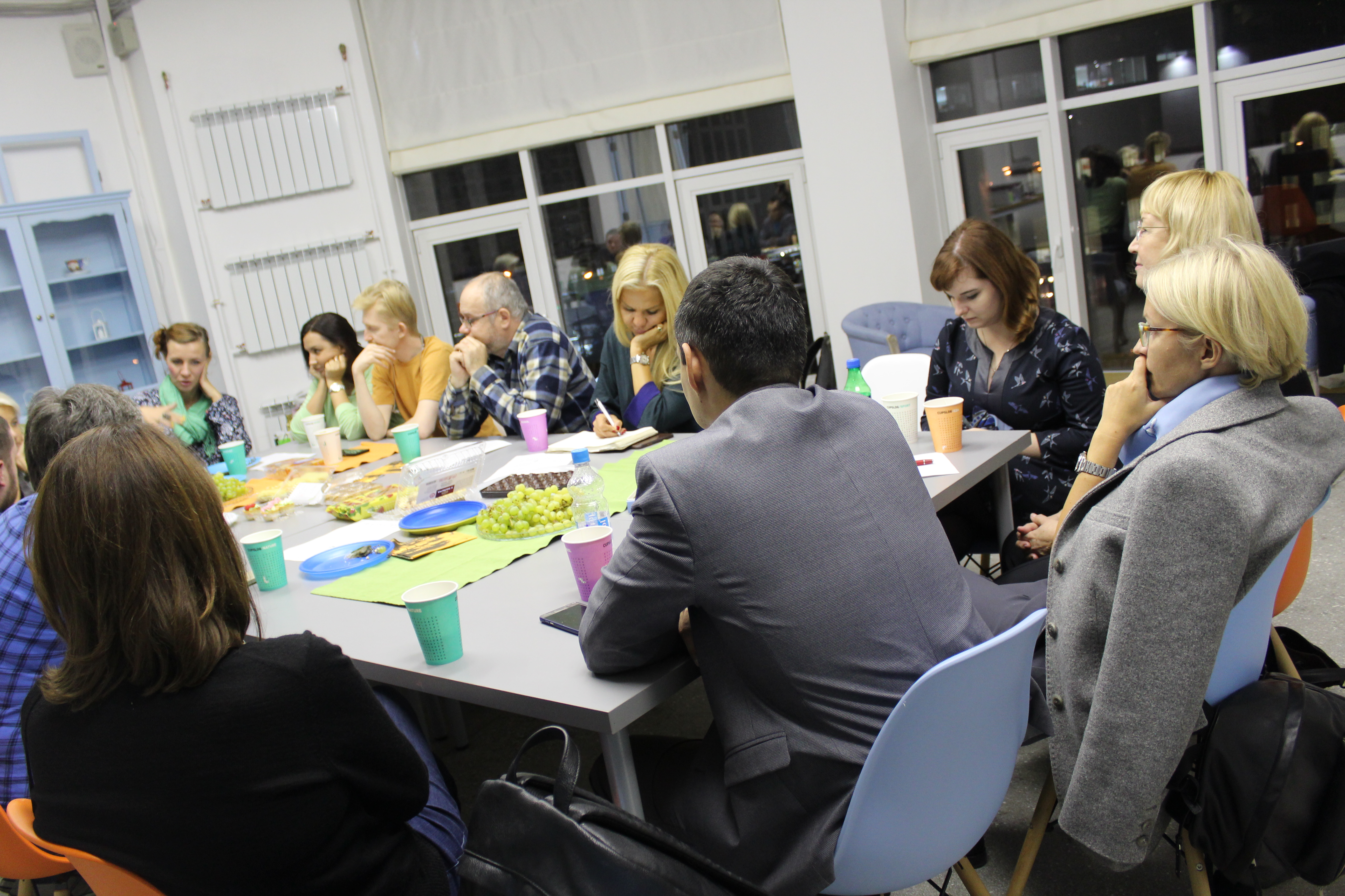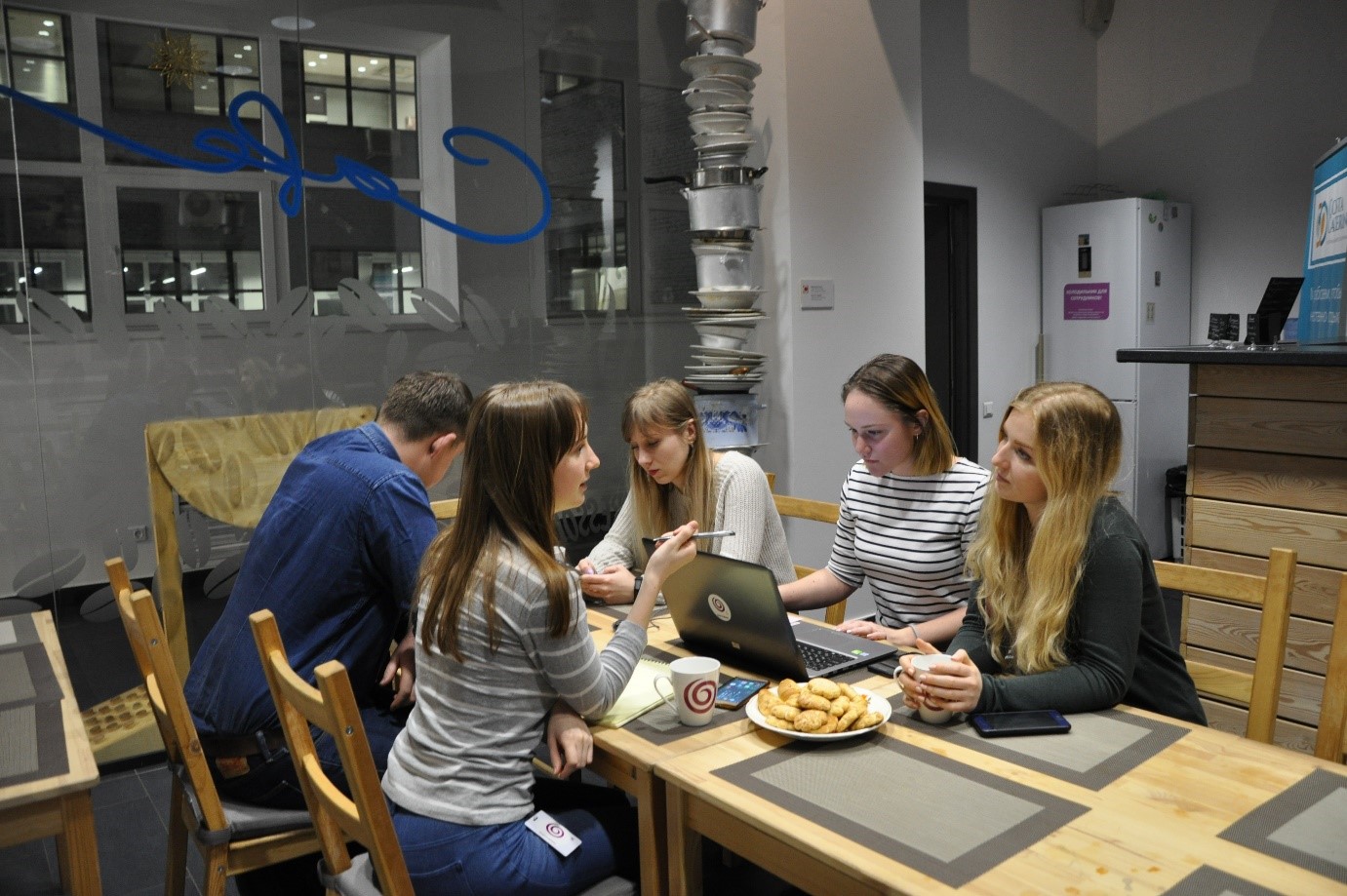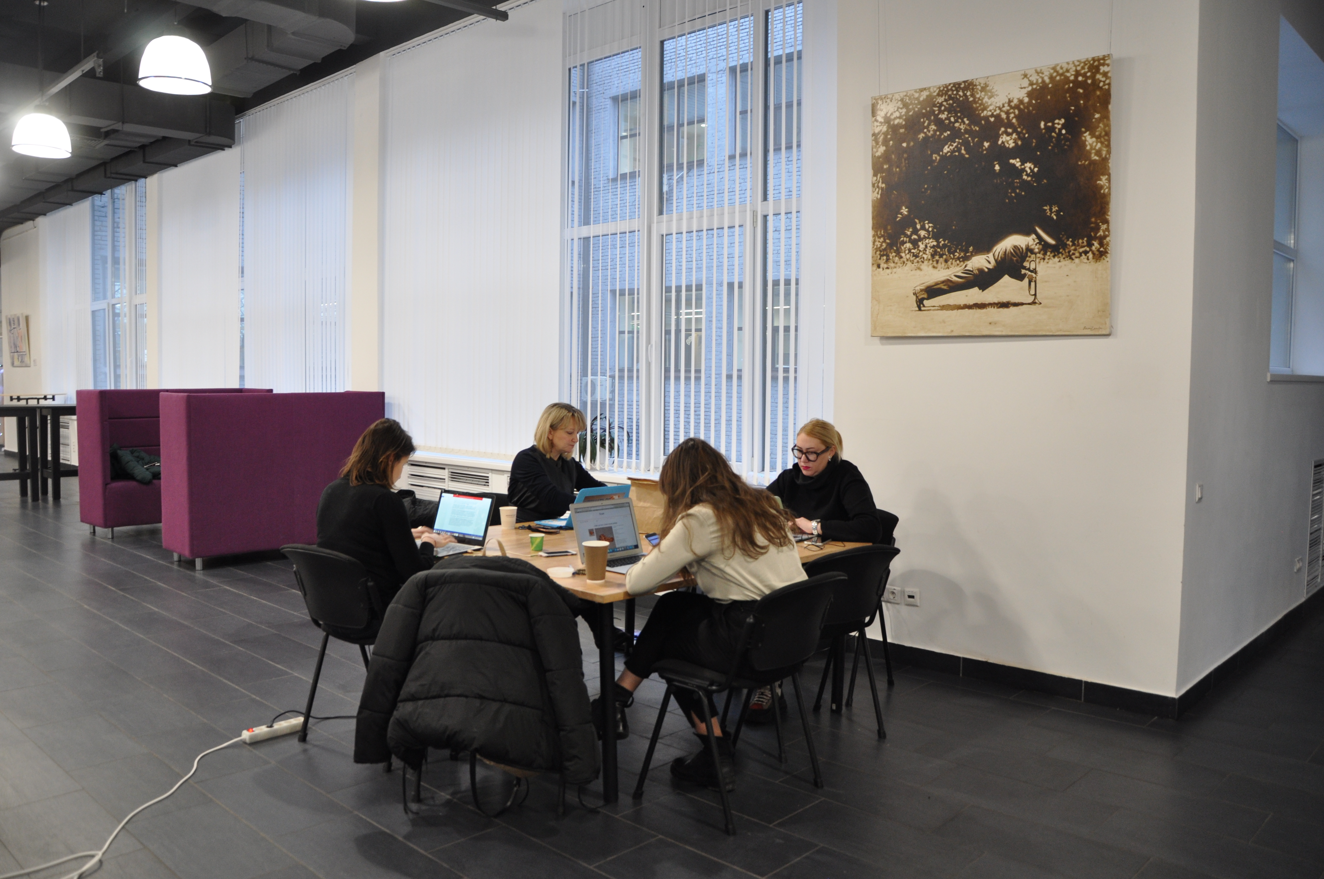 Правое крыло горизонтального пространства занимает коворкинг. Он не огорожен, через него проходят все, кто идет на события в Медиацентр, пункт буккроссинга или кафе. В коворкинг может прийти бесплатно поработать любой сотрудник некоммерческой организации или представитель волонтерской группы, в том числе оказавшийся в Москве проездом из другого города (надо только не забыть написать нам на почту заявку на день посещения), здесь всегда спокойная и дружелюбная атмосфера.