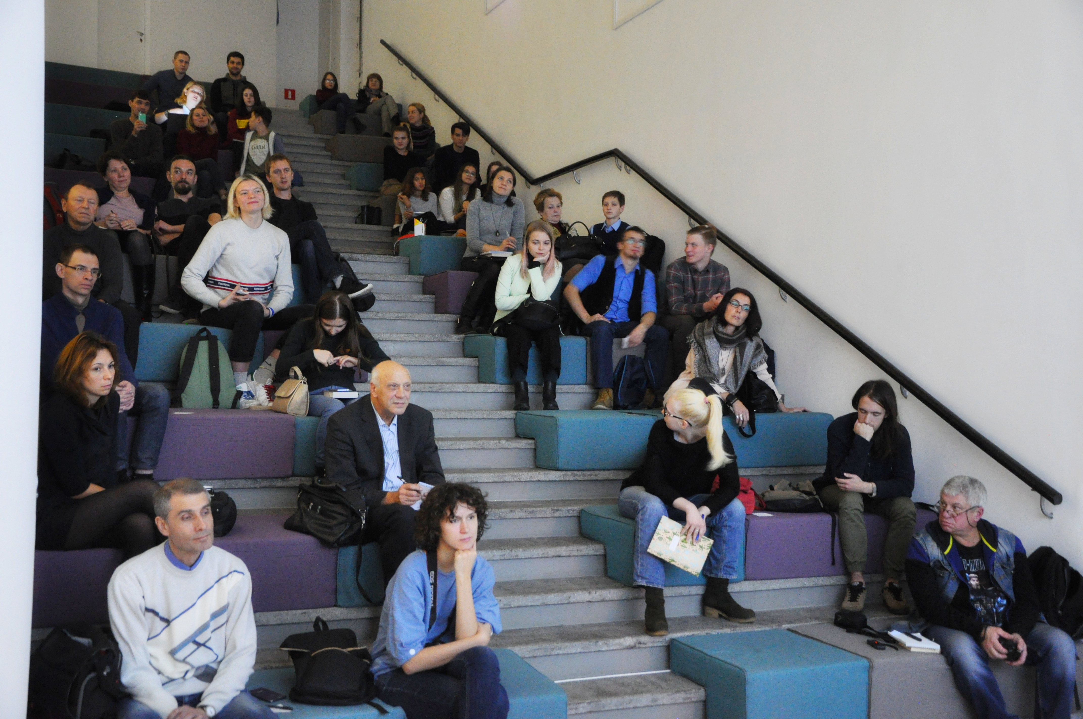 Лестница состоит из трех уровней: на первом уровне (что соответствует 2-му этажу здания) – Аэродром для мастер-классов и кофе-брейков, на втором – Стратосфера, самый большой лестничный пролет, из которого мы сделали лекторий, на третьем – Космос для клубных встреч.