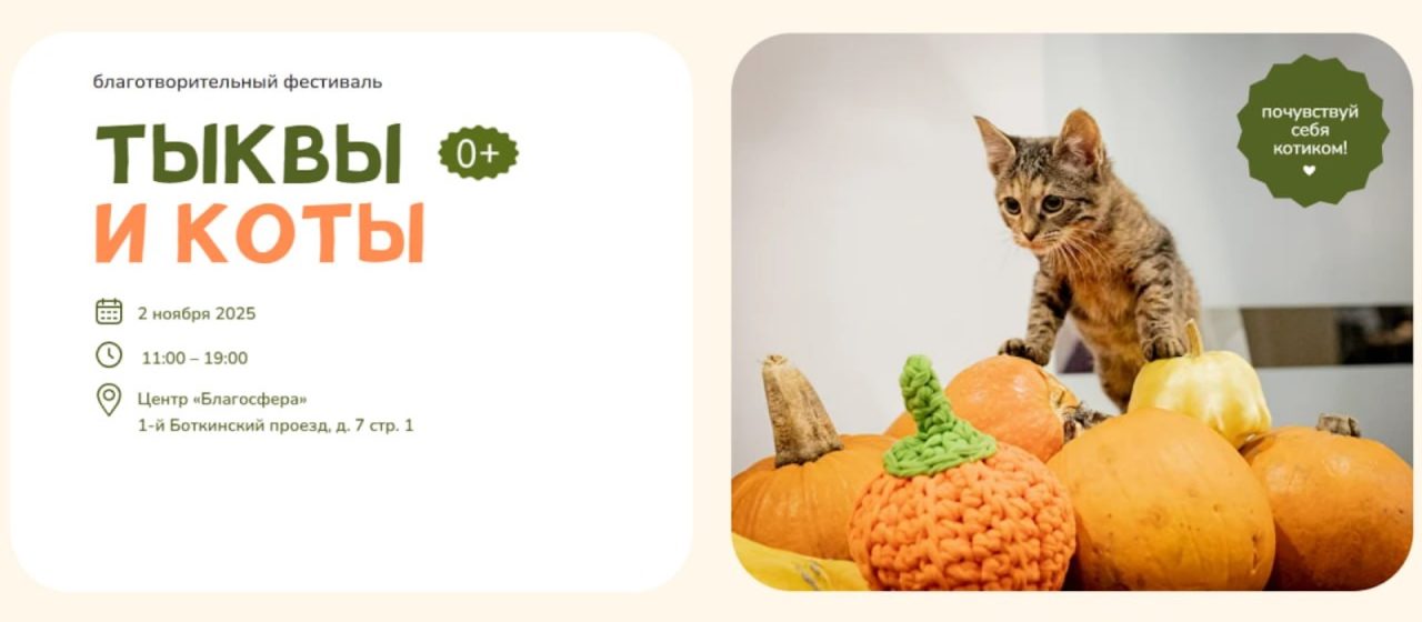 «Тыквы и Коты» – осенний семейный фестиваль, посвященный лени, удовольствиям, творческому отношению к тыкве и любви к кошкам и котам. Приглашаем всех любителей котиков погрузиться в атмосферу осеннего уюта и провести этот день в тёплой компании усатых и хвостатых.