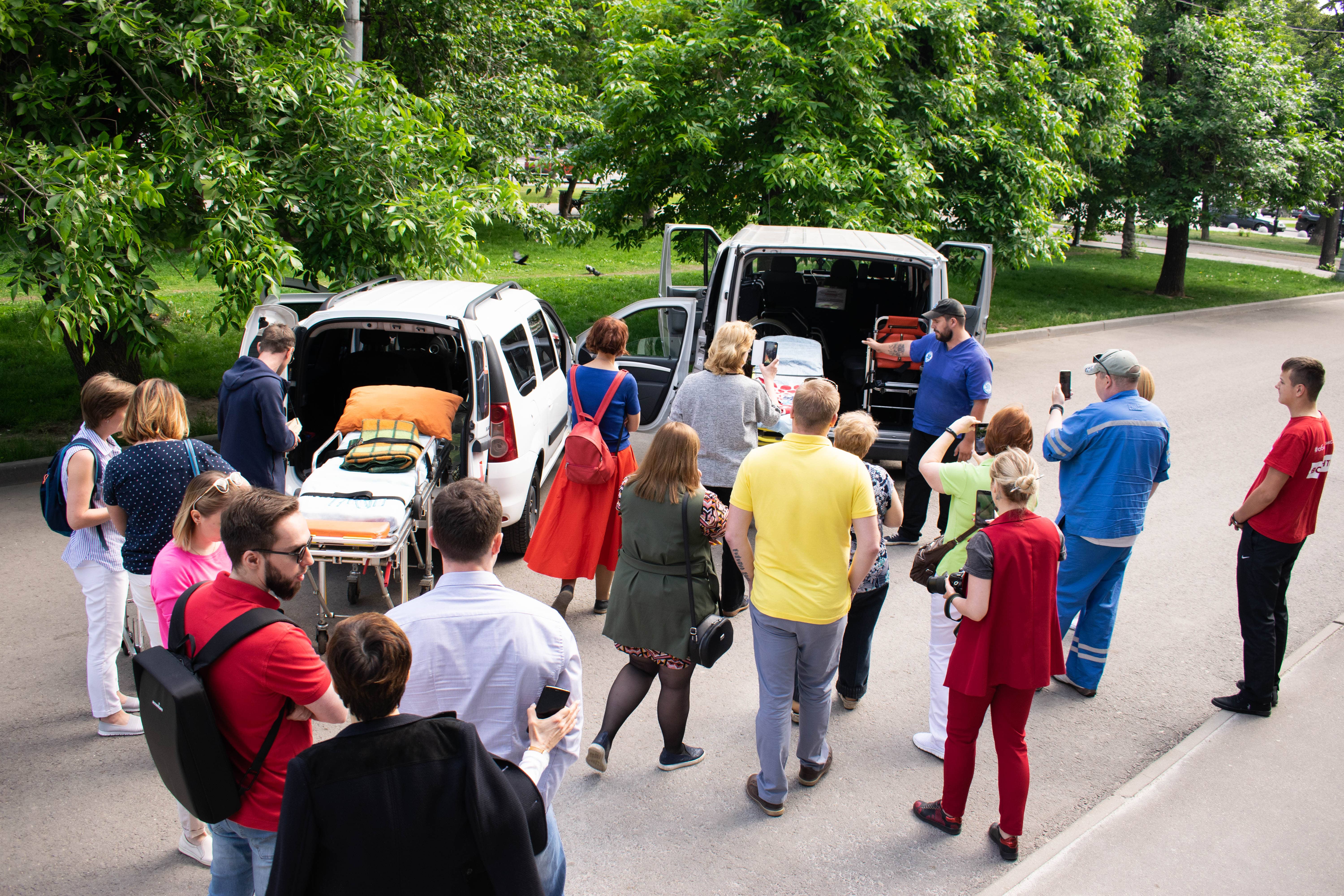 В начале выставки-лектория Pro_уход к «Благосфере» прибыли две машины для перевозки людей с инвалидностью. Гости и прохожие собрались у необычных автомобилей, где им рассказали и показали, как проходит транспортировка людей с ОВЗ.